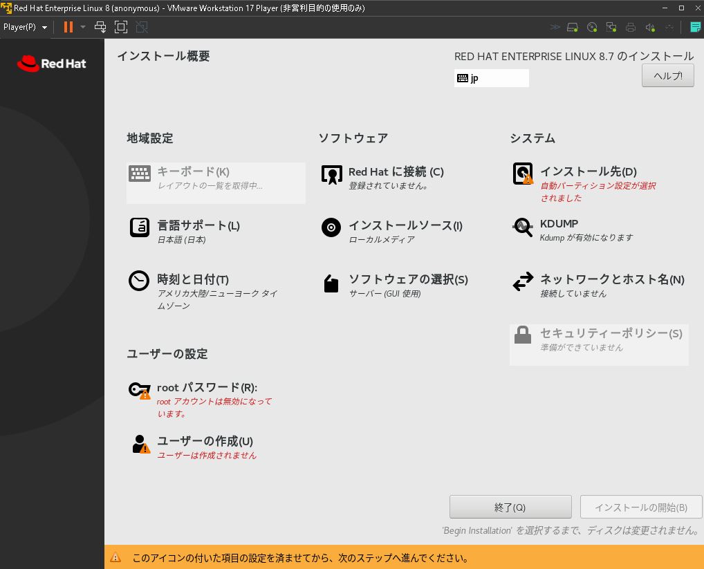 インストール時の画面サイズを1014x768に設定する場合「Install Red Hat Enterprise Linux 8.8」の選択画面で「TAB」キー押下し、オプション「inst.resolution=1024x768」 を追加入力して「Enter」キー押下する。
