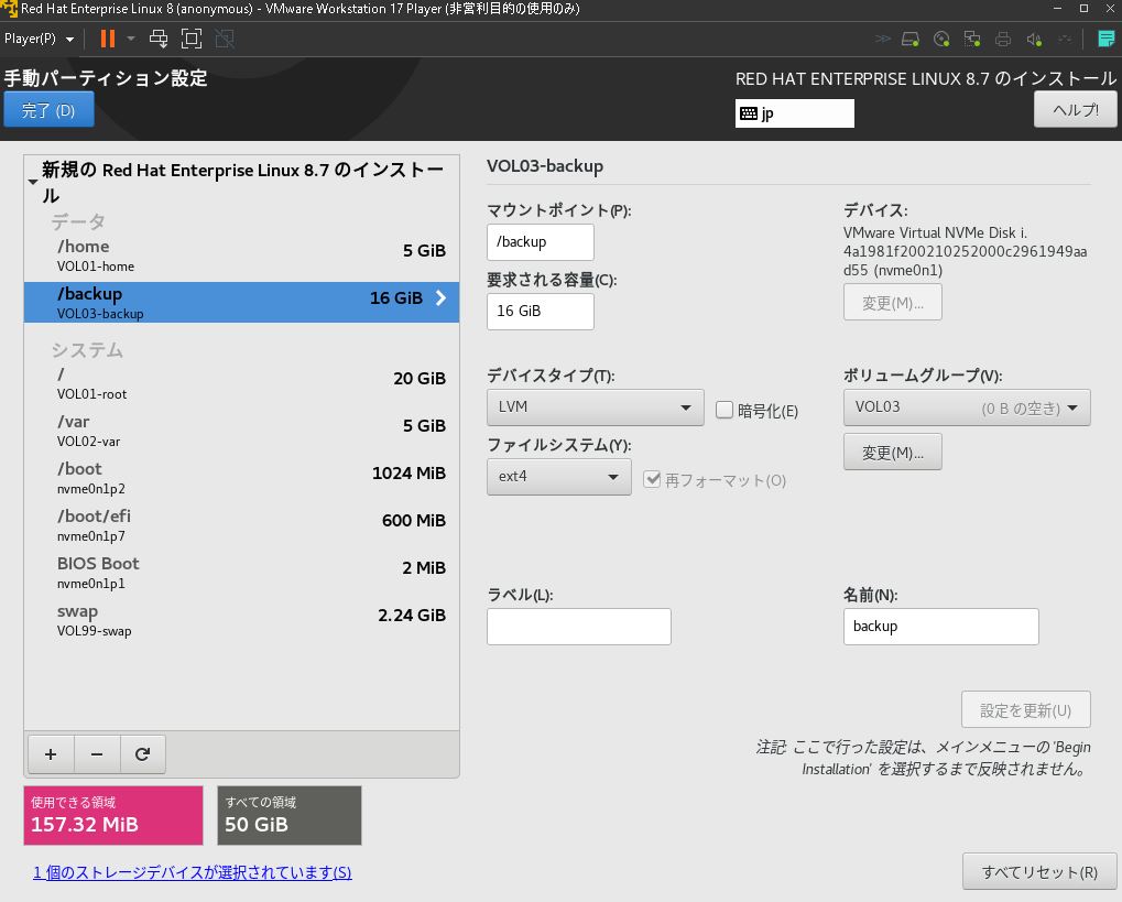 ディスク /dev/mapper/VOL03-backup: 16 GiB, 17179869184 バイト, 33554432 セクタ